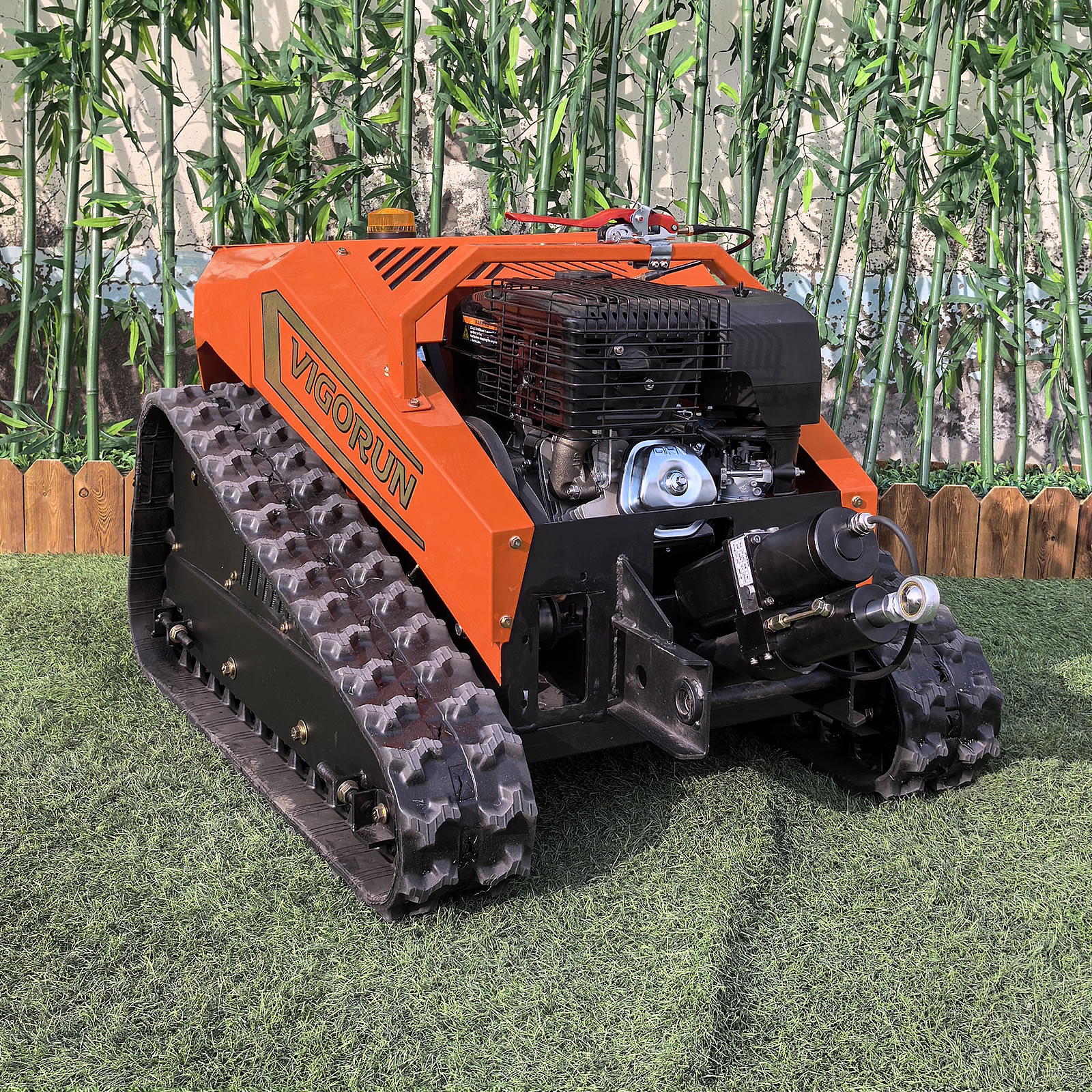 Remote control flail mower with Loncin electric start, single cylinder gasoline engine 9Kw, 2 pcs 48V 1000W servo control walking motors with electronic brakes, high-torque RV063 worm gear and worm reducer made of 12-2 tin bronze, 56V 4000W dynamo that can ensure charging while working.
